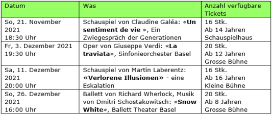 Im Rahmen der jährlichen Unterstützung an das Theater Basel bieten wir für die Bottminger Bevölkerung die Möglichkeit eines günstigen Theaterbesuchs. Für vier Abende im Herbst/Winter haben Sie die Möglichkeit, Tickets für eine Aufführung Ihrer Wahl zu kaufen. Für 20 Franken pro Eintrittsbillett kommen Einwohnerinnen und Einwohner von Bottmingen in den Genuss einer Vorstellung nach ihrem Gusto.