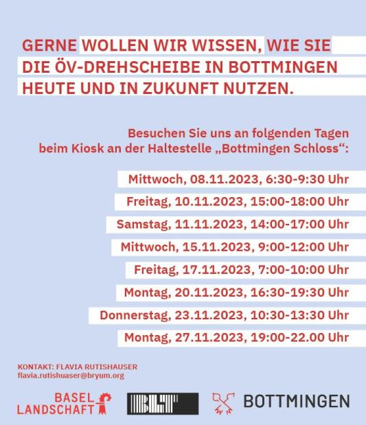 Wie an der Gemeindeversammlung vom 24. Oktober angekündigt, möchte das zuständige Planungsbüro die Bedürfnisse der Nutzenden dieser Verkehrsdrehscheibe besser kennenlernen. Aus diesem Grund eröffnet es im November 2023 direkt an der Haltestelle Bottmingen Schloss ein sogenanntes Open Office. Dort soll ein direkter persönlicher Austausch zwischen den Nutzenden und den Planenden stattfinden.