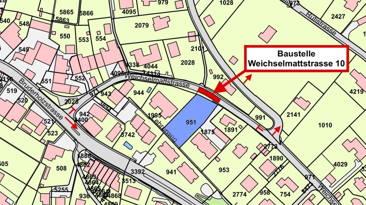Aufgrund von Werkleitungsarbeiten an der Weichselmattstrasse 10 wird die Weichselmattstrasse zwischen den Einfahrten Bruderholzstrasse und Pfaffenrainstrasse von Montag, 3. März 2025, bis Freitag, 14. März 2025, täglich zwischen 8-17 Uhr gesperrt. Eine Umleitung wird signalisiert. Ausserhalb dieser Zeiten – also von 17-8 Uhr sowie an den Wochenenden – bleibt die Strasse einspurig befahrbar. Der Gehweg ist von diesen Einschränkungen nicht betroffen und steht Fussgängern während der gesamten Bauzeit uneingeschränkt zur Verfügung. Mögliche Beeinträchtigungen durch die Baustelle sind nicht auszuschliessen.