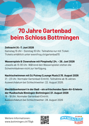 Vor 70 Jahren, am 14. Mai 1956, wurde das Gartenbad beim Schloss Bottmingen feierlich eröffnet. Das Bad ist weit mehr als ein Ort zum Schwimmen: Es ist Treffpunkt, Rückzugsort und sommerliches Wohnzimmer für Generationen von Menschen aus dem Leimental und der ganzen Region. Eingebettet in die besondere Umgebung beim Schloss verbindet es Natur, Erholung und Gemeinschaft auf einzigartige Weise.