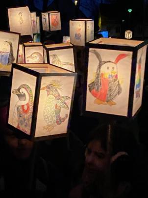 Der Laternenumzug hielt immer wieder kurz inne – eine wunderbare Gelegenheit für die vielen Zuschauer am Straßenrand, die kunstvollen Laternen und ihre stolzen Gestalter aus nächster Nähe zu bewundern und fotografisch festzuhalten. „Geht etwas langsamer und haltet die Laterne schön gerade!“, rief ein Lehrer einer Gruppe Kinder zu, die mit eiligen Schritten versuchten, den Anschluss an die Klasse vor ihnen nicht zu verlieren. Die Klasse 3b des Burggartenschulhauses brachte das Thema Dinosaurier auf kreative Weise zum Leuchten: Mit selbst gestalteten Kopflaternen verwandelten sich die Schülerinnen und Schüler in riesige Dinosaurier – eine originelle Ergänzung zu ihrem NMG-Unterricht. Die Klasse 4b liess sich hingegen von der Kunst Picassos inspirieren und präsentierte farbenfrohe, kunstvoll gestaltete Gesichter auf ihren Laternen, die eindrucksvoll in der Dunkelheit strahlten. Die Klasse 6a des Talholzschulhauses arbeitete acht Wochen lang an ihren beeindruckenden Laternen. Mit viel Geduld und Kreativität entstanden leuchtende Kunstwerke, die mit Anime-, Disney- und Pokémonfiguren sowie fantasievollen Doodles verziert waren. „Erst letzte Woche haben wir die letzten Details fertiggestellt“, erzählte der Lehrer der 6a. Die Laternen waren so groß, dass sie nur zu viert getragen werden konnten – eine echte Herausforderung für die Schülerinnen und Schüler.